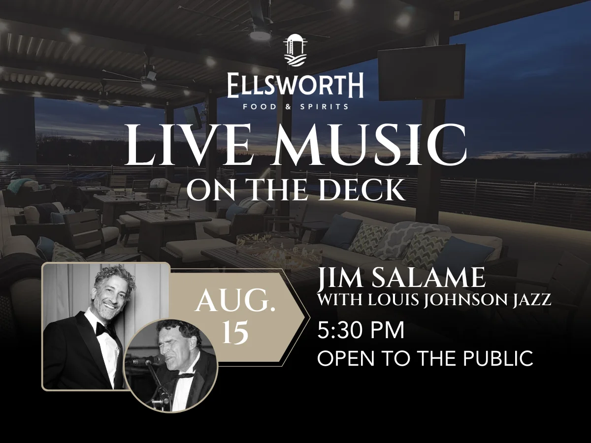 Live Music on the Deck Live Music on the Deck with Jim Salame & Louis Johnson Jazz Kick off your weekend with a delicious bite to eat and your favorite hand-crafted cocktails with family and friends! Live Music begins at 5:30pm + Add to Google Calendar + iCal / Outlook export Date Aug 15 2025 Expired! Time 5:30 pm Category Social Events Share this event