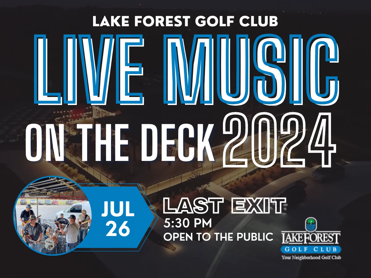 Live Music on the Deck with Last Exit Live Music on the Deck 5:30PM Open to the Public + Add to Google Calendar + iCal / Outlook export Date Jul 26 2024 Expired! Time 5:30 pm - 10:00 pm Category Social Events Share this event